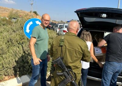 Yesterday, we delivered food packages to older people from Sderot who are being evacuated. We also went to the city of Ofakim, whose residents experienced tough days; terrorists entered the town, many people died, and residents are under constant rocket fire. Six people from the Holocaust survivors‘ club with whom we work were killed on the first day of the attack!