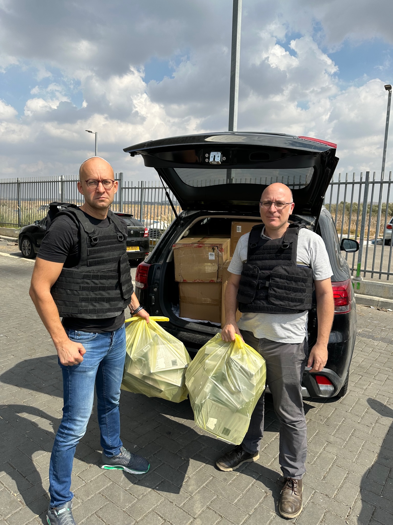 Yesterday, we delivered food packages to older people from Sderot who are being evacuated. We also went to the city of Ofakim, whose residents experienced tough days; terrorists entered the town, many people died, and residents are under constant rocket fire. Six people from the Holocaust survivors‘ club with whom we work were killed on the first day of the attack!